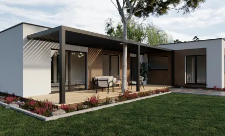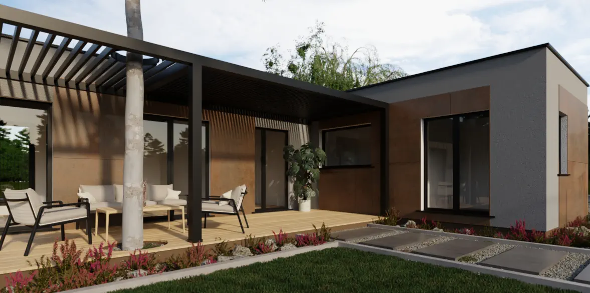 Die optionale Terrasse, bietet den Bewohnern Privatsphäre und ist auf natürliche Weise mit dem Tragwerk des Hauses verbunden.