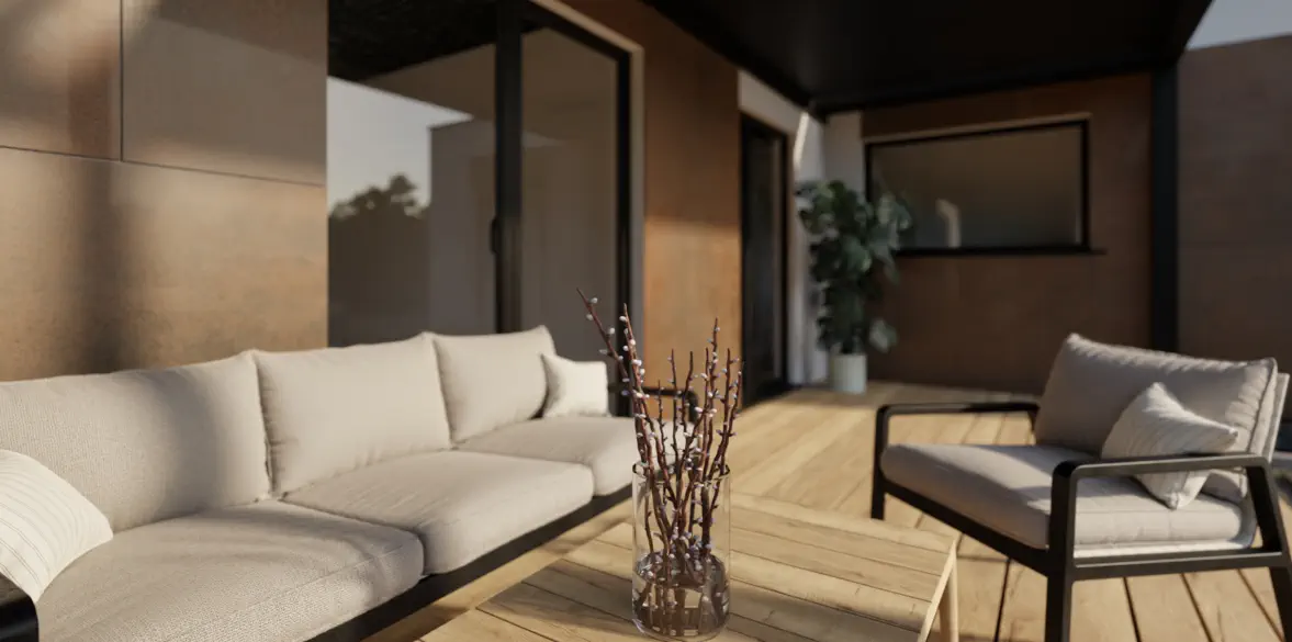 Die optionale Terrasse, bietet den Bewohnern Privatsphäre und ist auf natürliche Weise mit dem Tragwerk des Hauses verbunden.