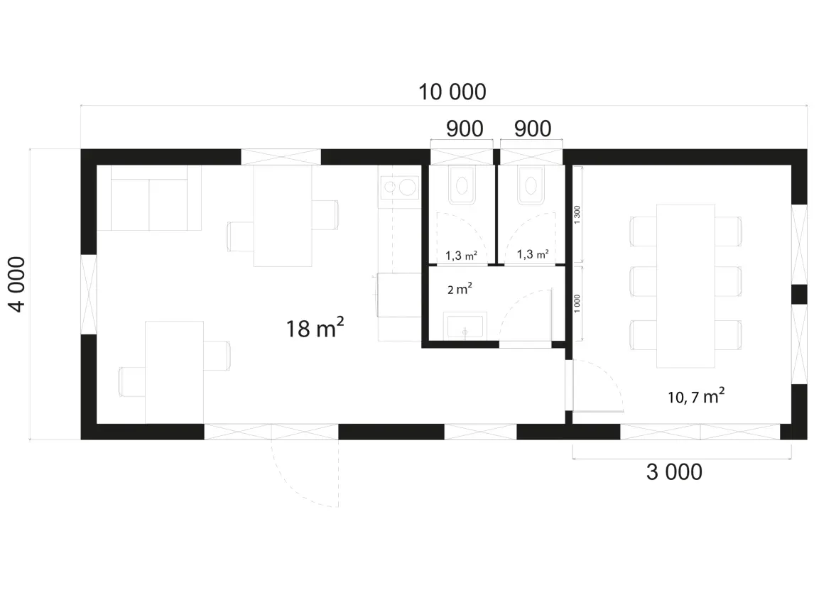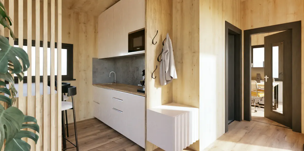 einem Erlebnis. Die abgetrennte Küchenecke mit Barbestuhlung sowie die Möglichkeit der separaten Damen-/Herren Toiletten runden das Office ab.