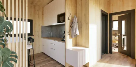 EG: Wohnküche, Zimmer, Bad, WC, Garderobe